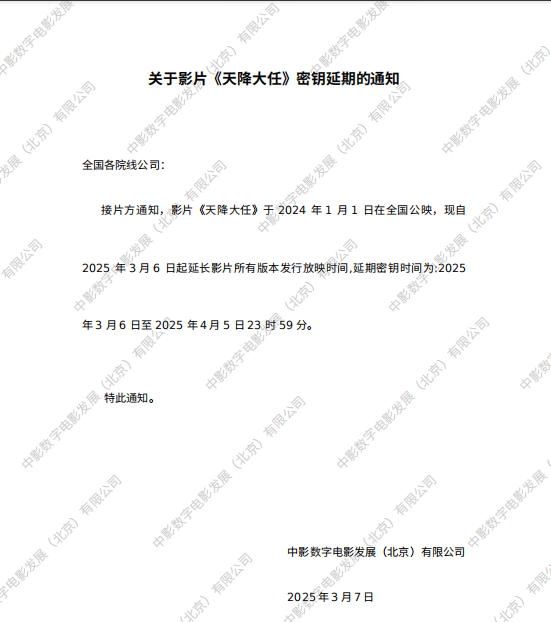 《天降大任》第九次密钥延期的通知