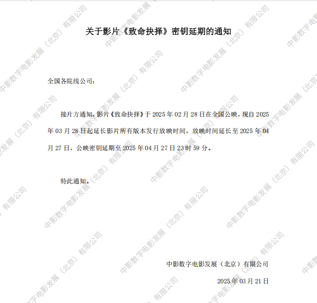 《致命抉择》档期变更的通知