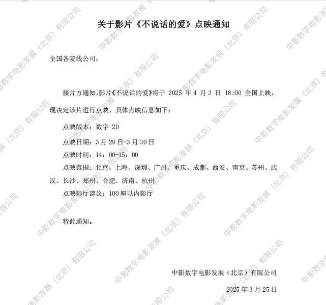 《不说话的爱》密钥延期及票房结算标准调整的通知