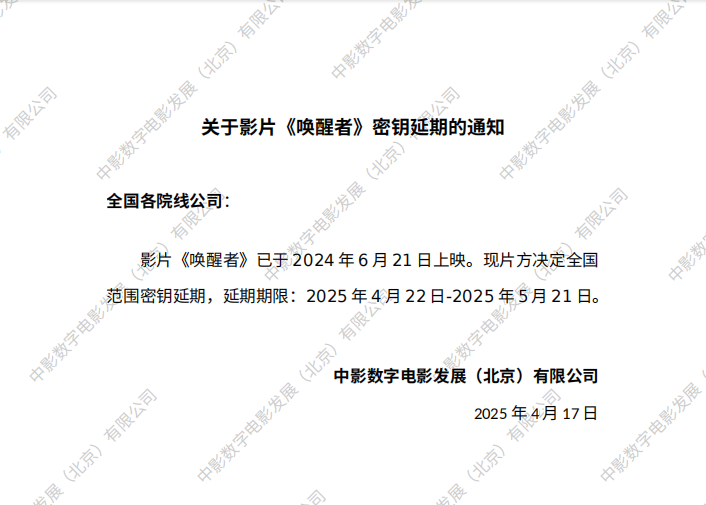 关于影片《唤醒者》密钥延期的通知