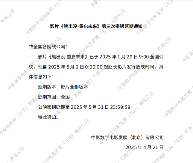 《熊出没·重启未来》第四次密钥延期的通知