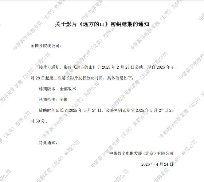 关于影片《远方的山》第五次密钥延期的通知