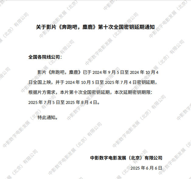 关于影片《奔跑吧,麋鹿》第九次全国密钥延期通知