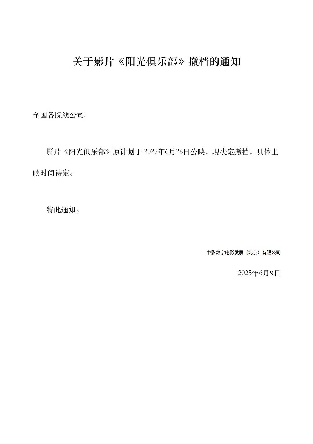 关于影片《阳光俱乐部》撤档的通知