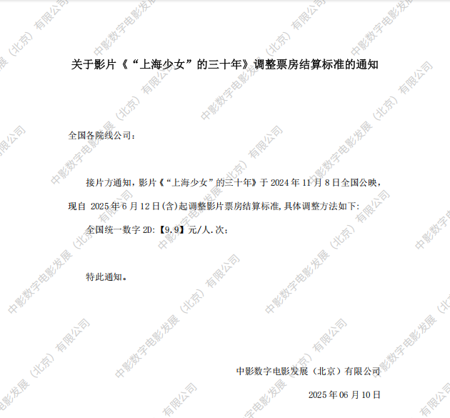 《“上海少女”的三十年》第二次调整票房结算标准的通知