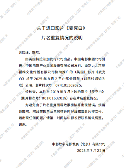 数字版影片《麦克白》发行通知(第一次延期)