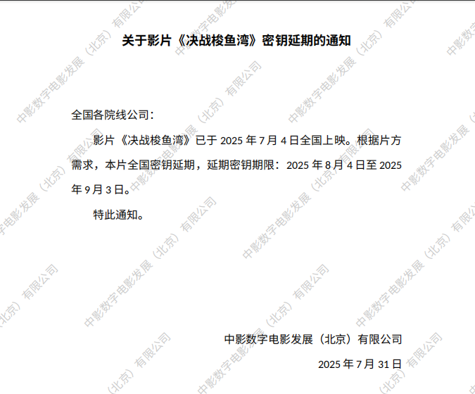 关于影片《决战梭鱼湾》第二次全国密钥延期通知