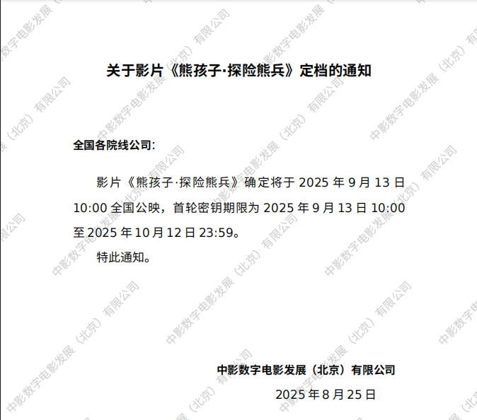 关于影片《熊孩子·探险熊兵》第一次密钥延期的通知