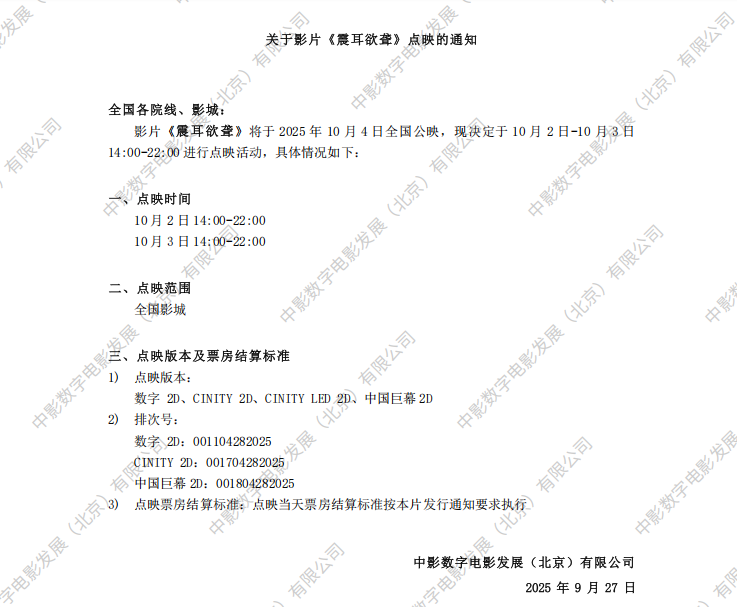 关于影片《震耳欲聋》调整票房结算标准的通知