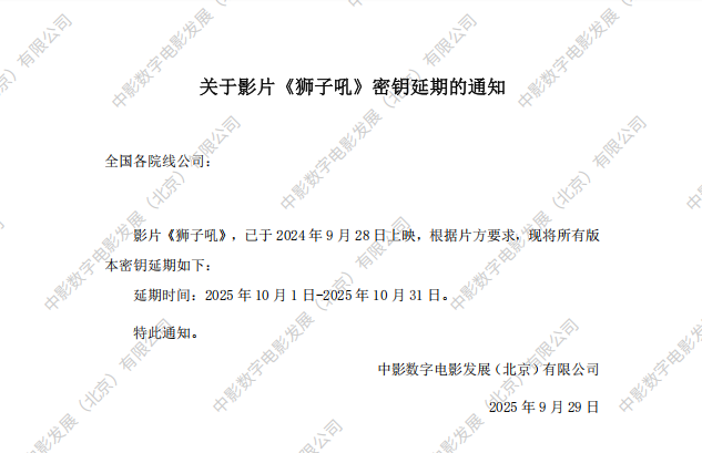 关于影片《狮子吼》密钥延期的通知