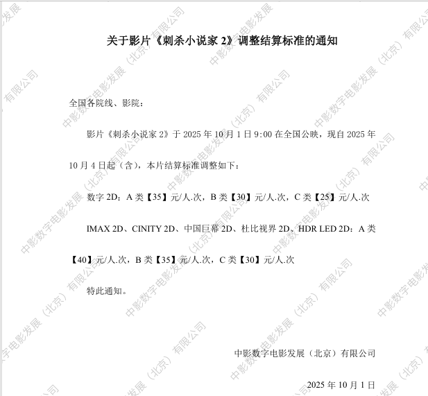 关于影片《刺杀小说家2》调整结算标准的通知