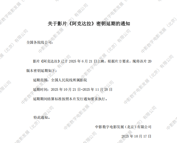 《阿克达拉》第二次密钥延期的通知
