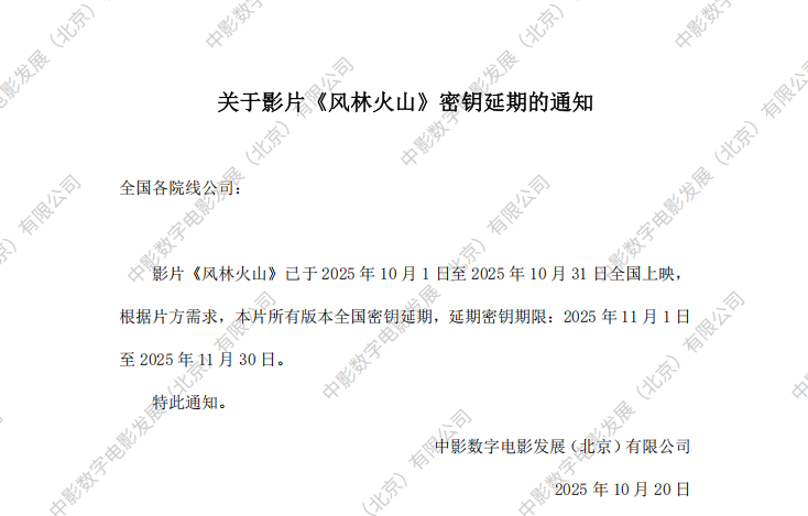 关于影片《风林火山》调整票房结算标准的通知
