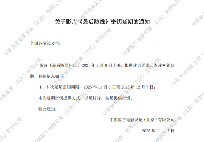 关于影片《最后防线》第三次密钥延期及调整票房结算标准的通知