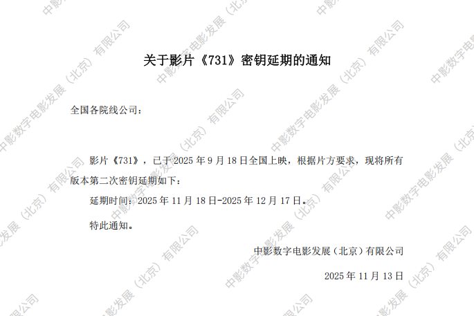 关于影片《731》延期密钥申请的通知