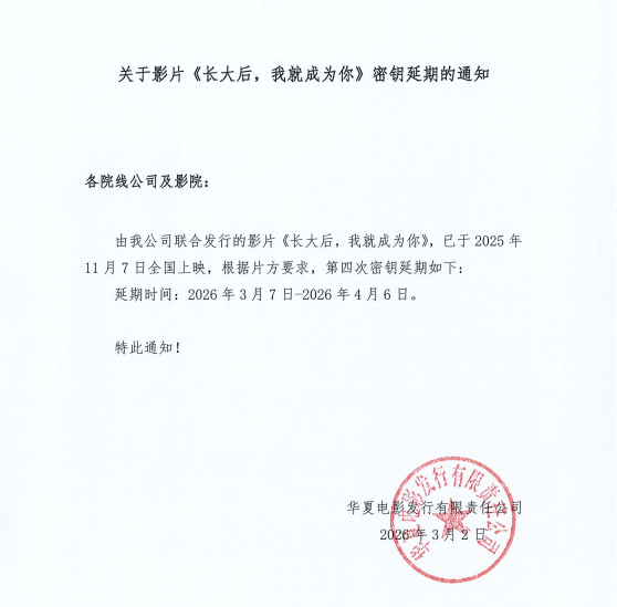 关于影片《长大后,我就成为你》第二次密钥延期的通知