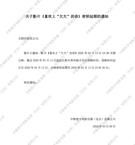 《喜欢上“欠欠”的你》调整票房结算标准的通知