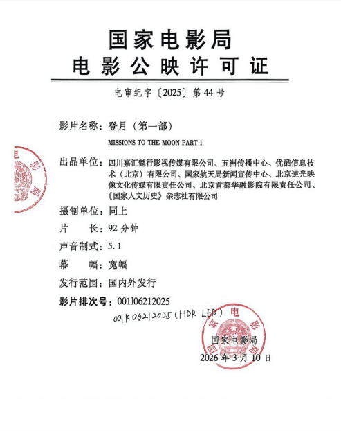 2026年是“十五五”规划开局之年,也是中国航天事业创建70周年,《登月(第一部)》作为首部聚焦探月工程嫦娥六号任务的纪录电影,在4月24日“中国航天日”上映。影片将复杂的航天技术、宏大的探月工程转化为通俗易懂、生动鲜活的影像内容,让观众在沉浸式体验中了解探月知识、感受航天魅力,有助于激发全民对航天事业的兴趣与热情,持续弘扬航天精神和探月精神,在全社会引导树立崇尚科学、勇于创新的良好风尚,为建设航天强国打下坚实基础。