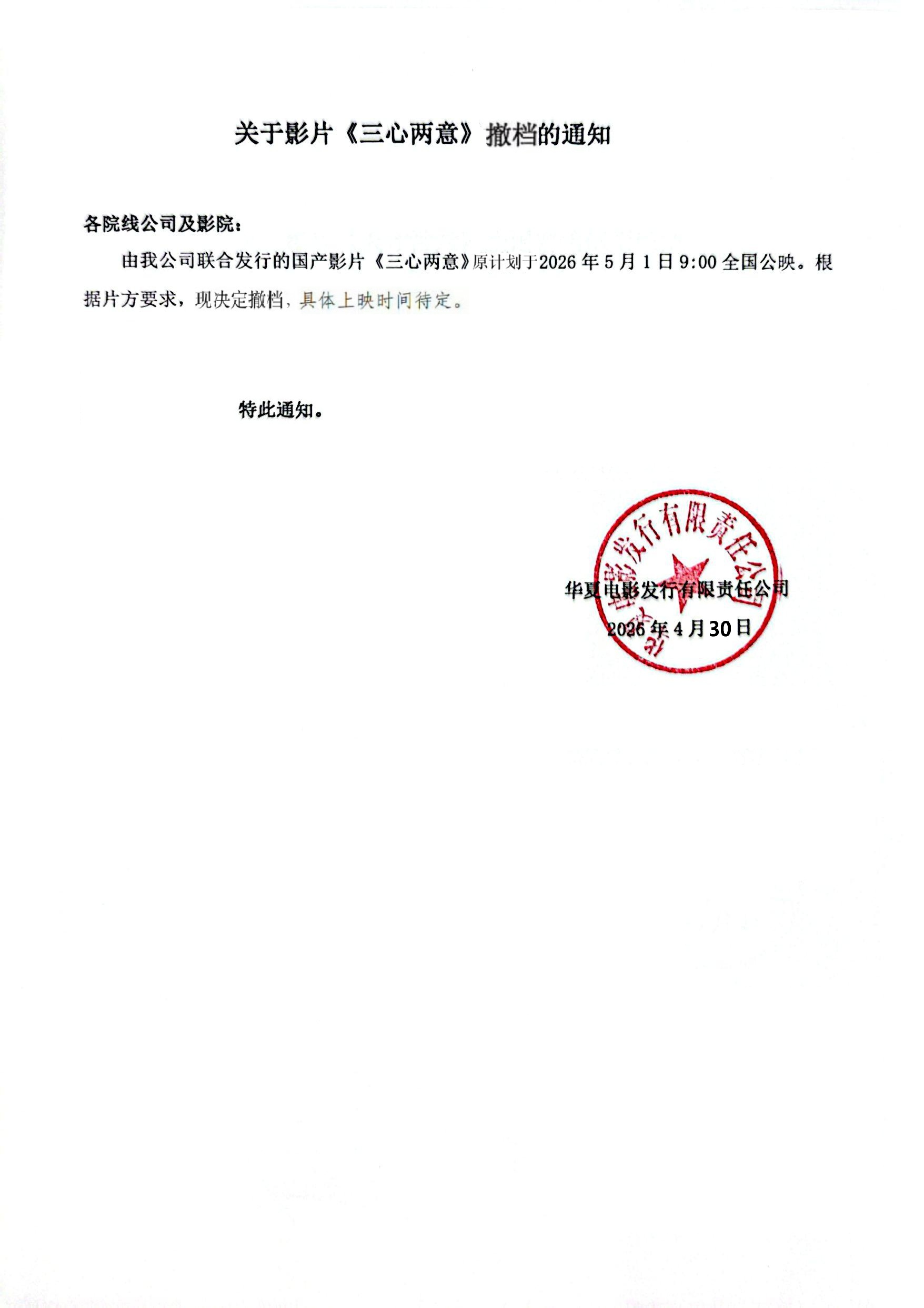 发行通知 » 《三心两意》撤档的通知