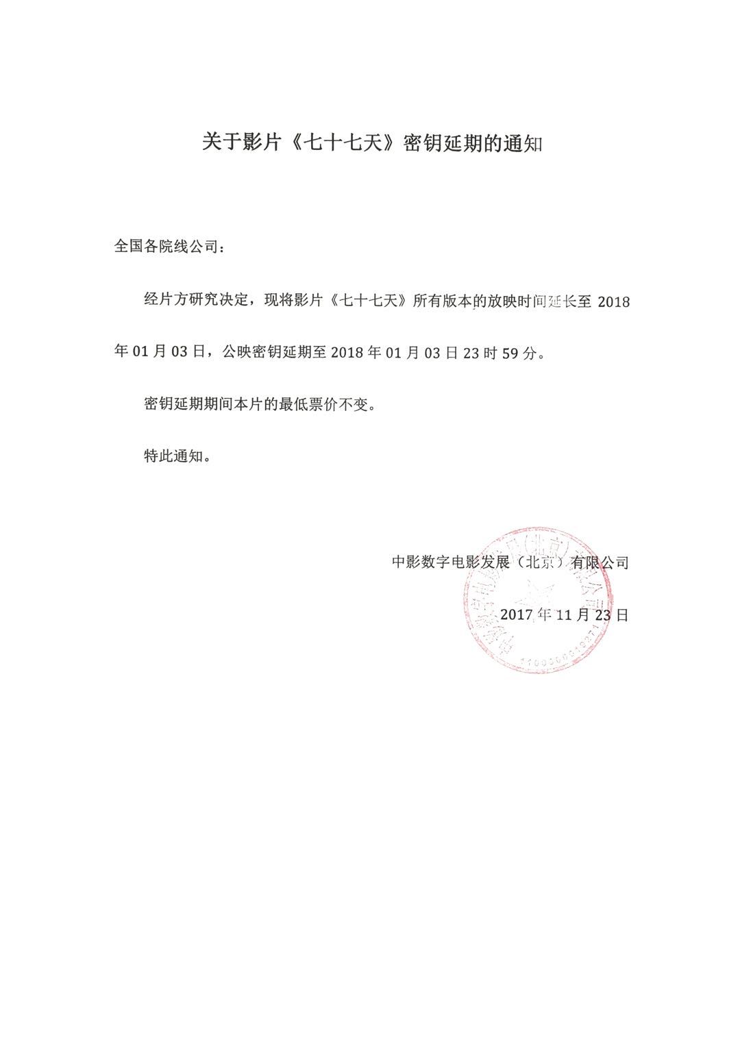 关于影片《七十七天》密钥延期的通知