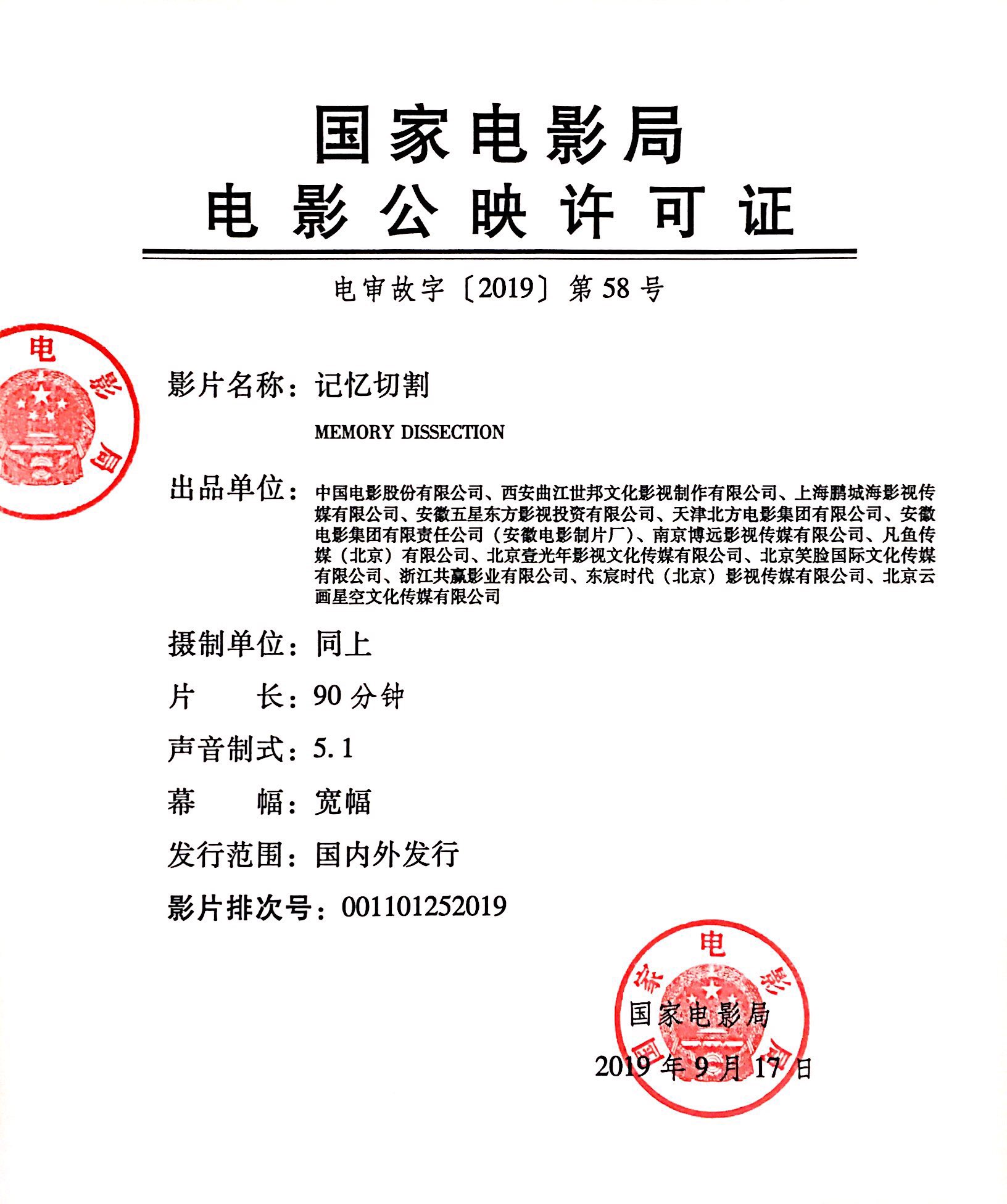 发行版本:数字 2D 5.1(普通话) 排次号:数字 2D(001101252019) 发行范围:全国