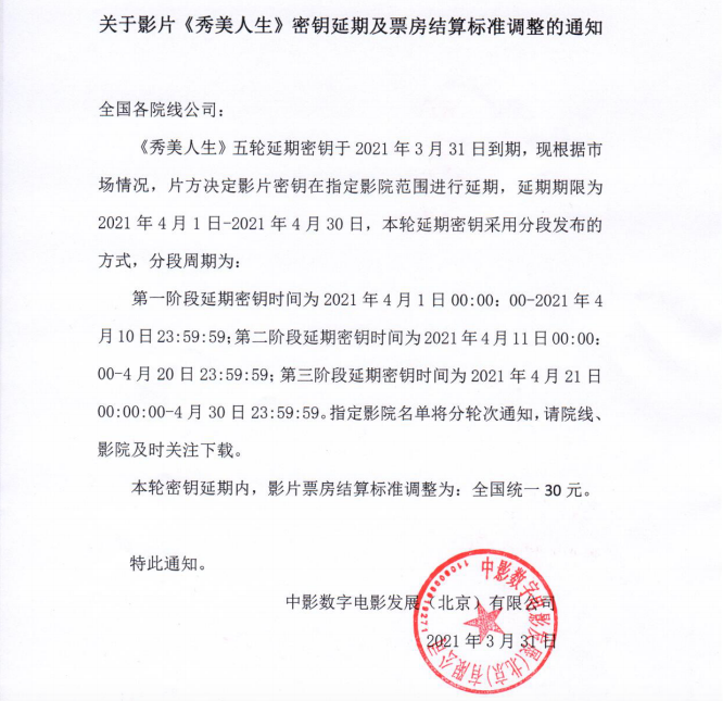 关于影片《秀美人生》密钥延期、变更密钥发放规则及调整票房结算标准的通知