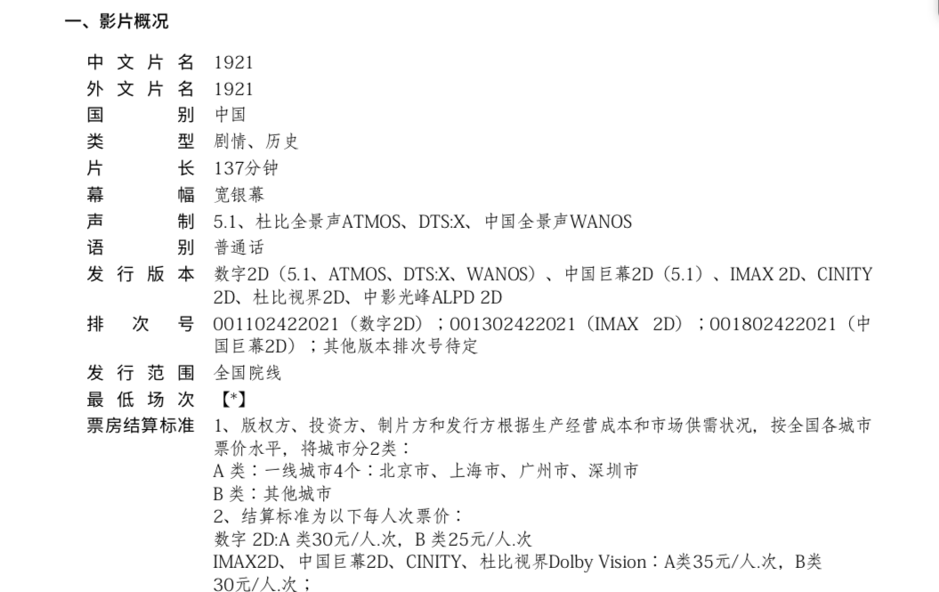 二十大展映影片《1921》发行通知
