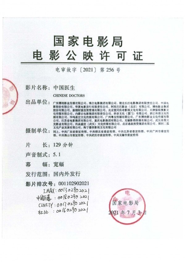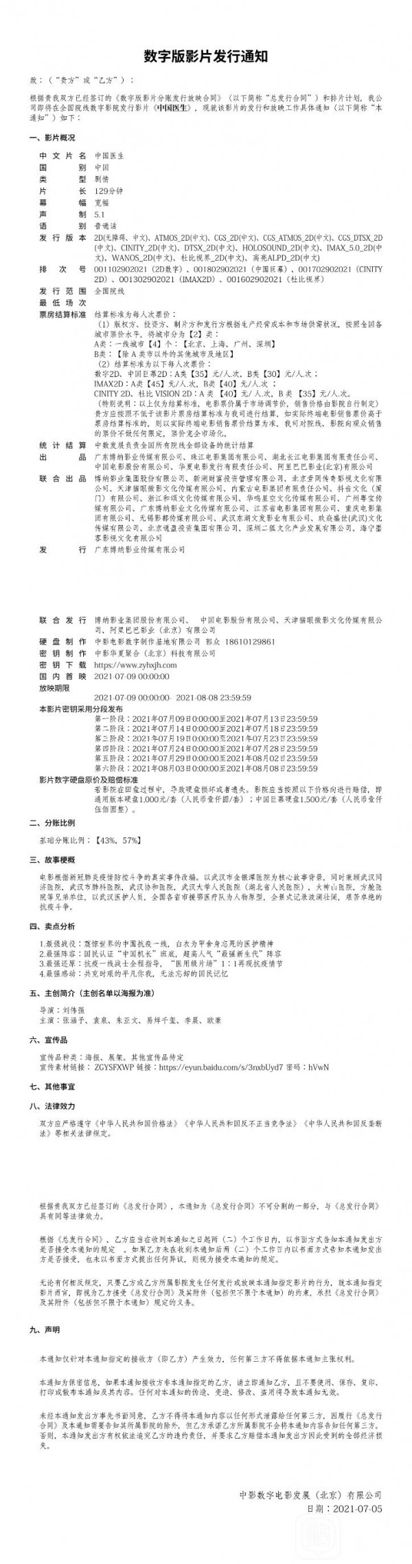 关于下调影片《中国医生》分账比例和最低结算价的通知
