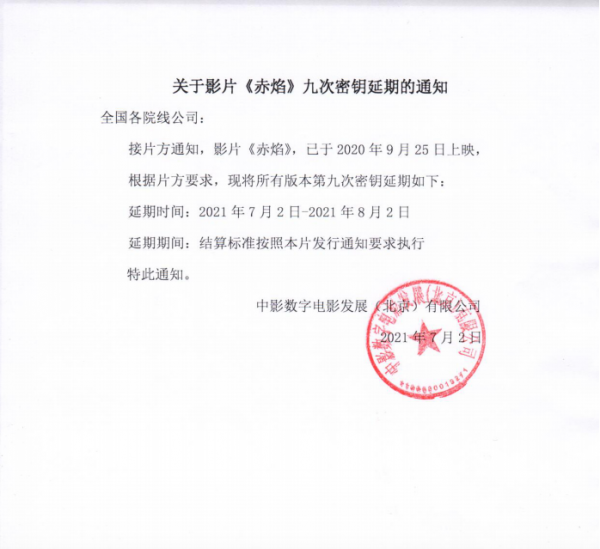 关于影片《赤焰》密钥延期的通知
