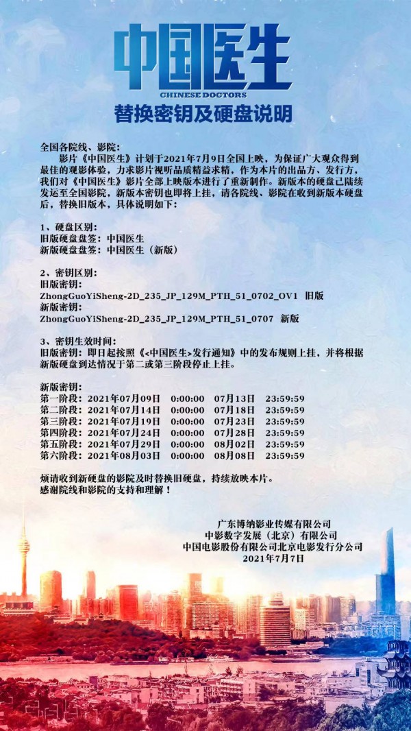 关于下调影片《中国医生》分账比例和最低结算价的通知