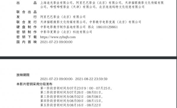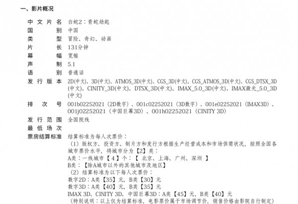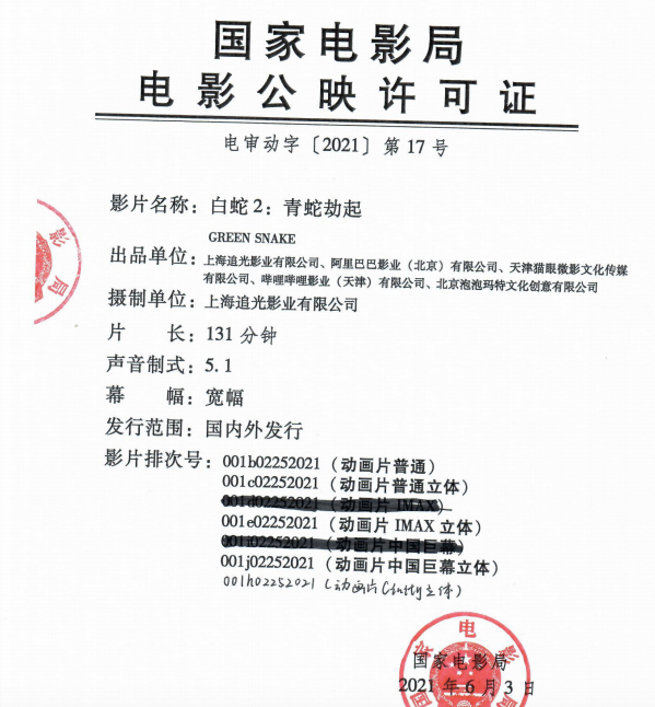 《白蛇2:青蛇劫起》密钥延期及调整票房结算标准的通知