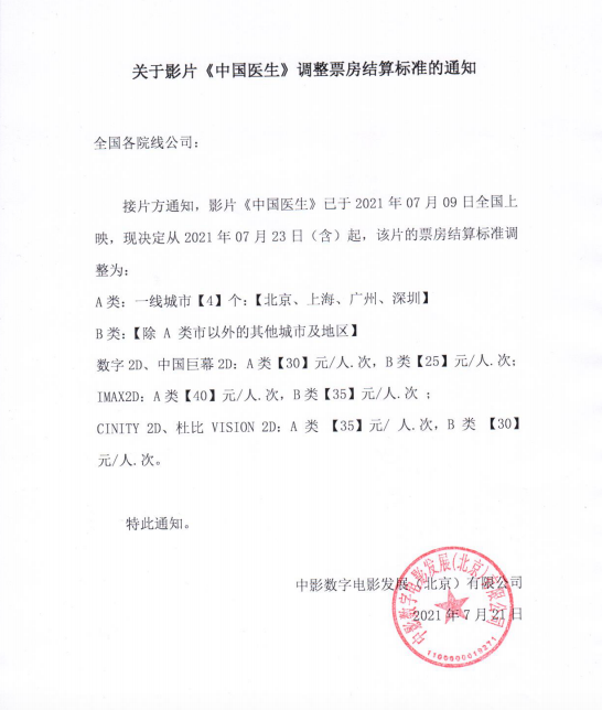 关于下调影片《中国医生》分账比例和最低结算价的通知