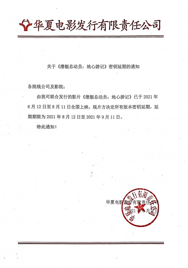 关于影片《潜艇总动员:地心游记》密钥延期的通知