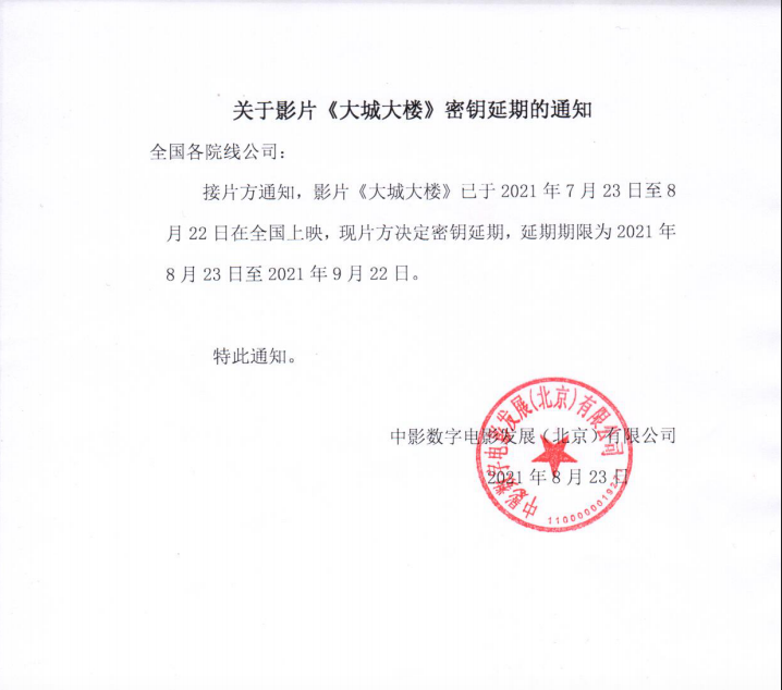 关于影片《大城大楼》密钥延期的通知