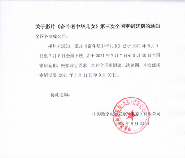 《奋斗吧中华儿女》第六次全国密钥延期及调整票价结算标准的通知