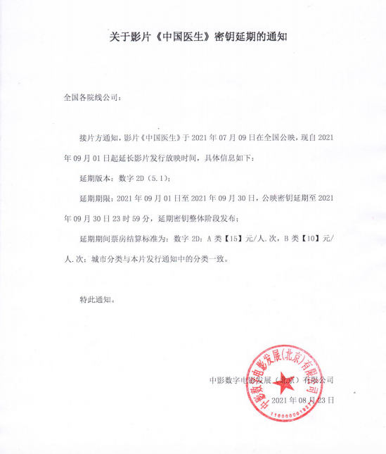 关于下调影片《中国医生》分账比例和最低结算价的通知