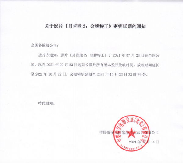 《贝肯熊2:金牌特工》密钥延期及调整票房结算标准