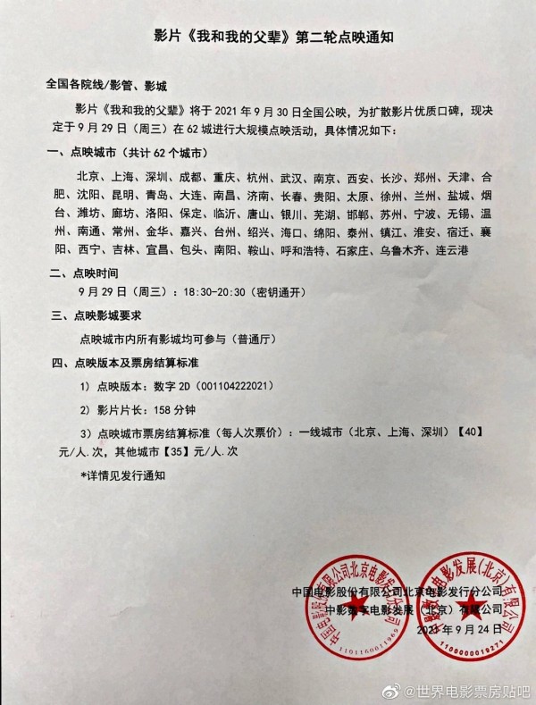 二十大展映影片《我和我的父辈》发行通知