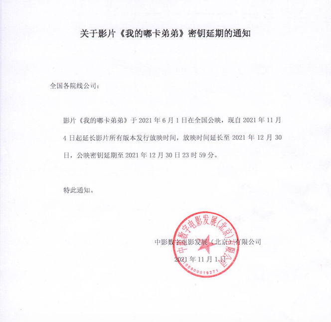关于影片《我的嘟卡弟弟》密钥延期的通知