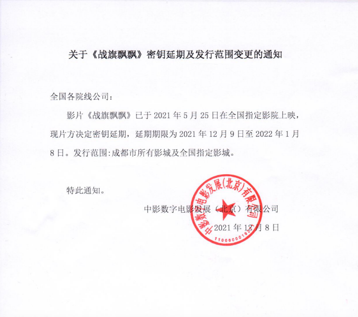 《战旗飘飘》密钥延期通知及发行范围变更的通知