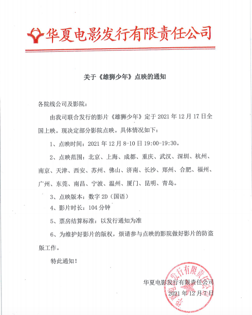 《雄狮少年》密钥延期及调整票房结算标准的通知