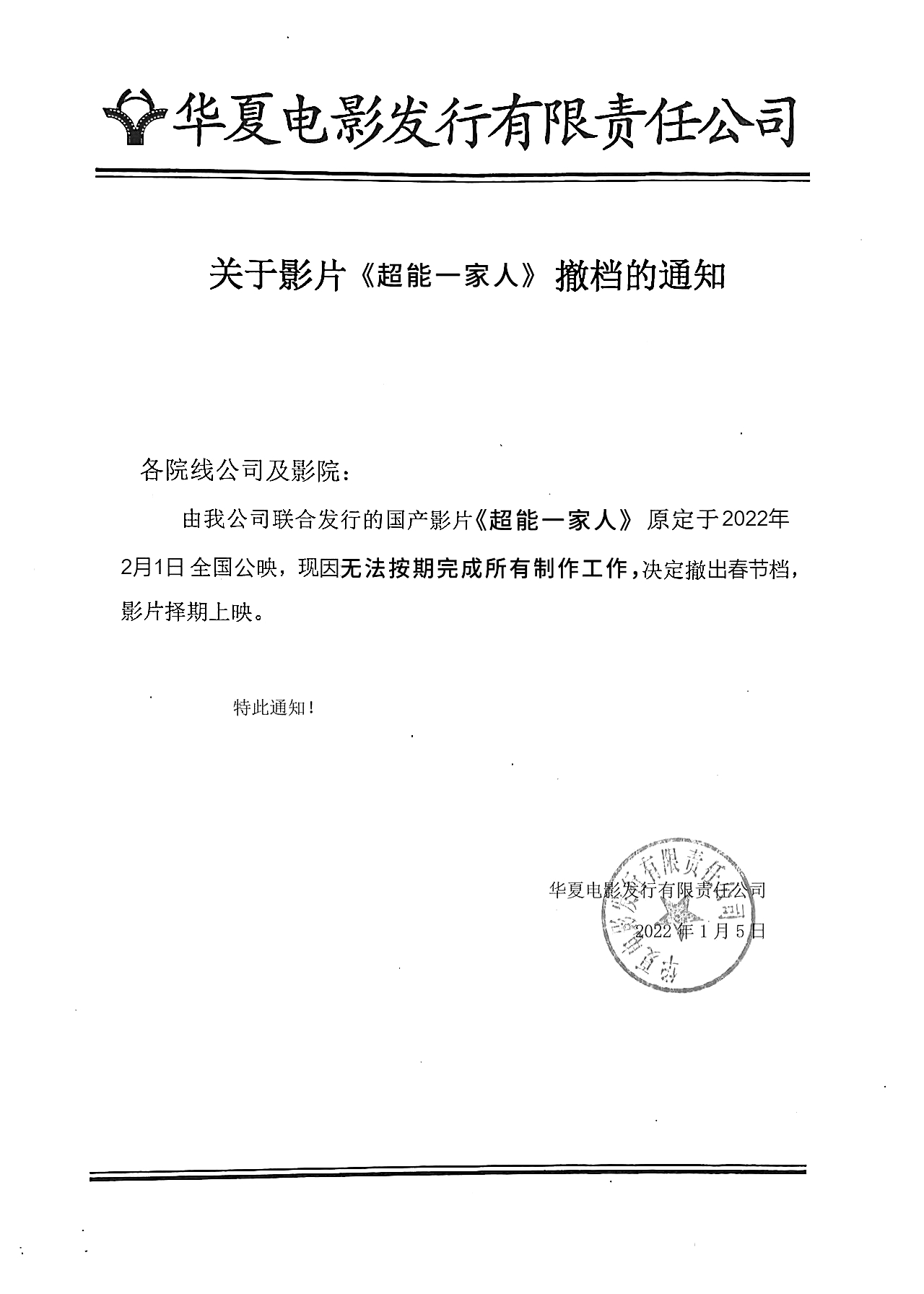 发行通知 » 《超能一家人》撤档通知 华夏电影
