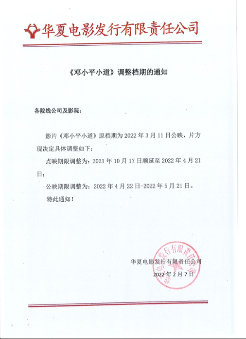 《邓小平小道》第十五次以场订片的通知