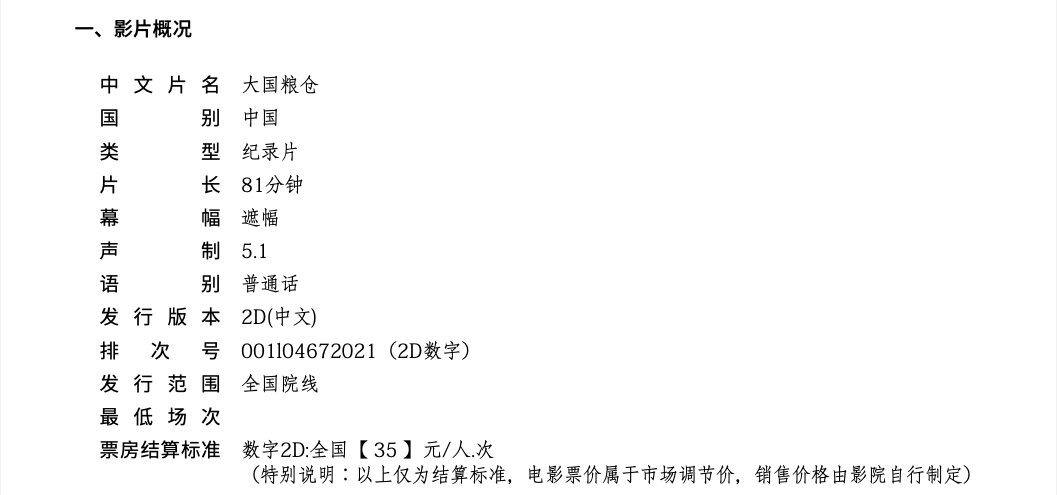 《大国粮仓》调整票房结算标准的通知