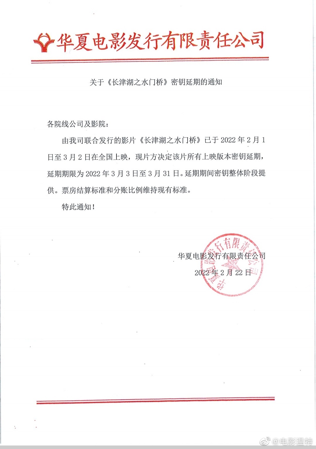 《长津湖之水门桥》密钥延期的通知