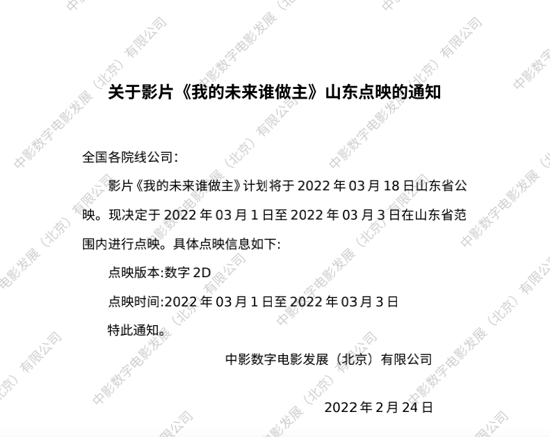 发行通知 » 《我的未来谁做主》山东点映的通知