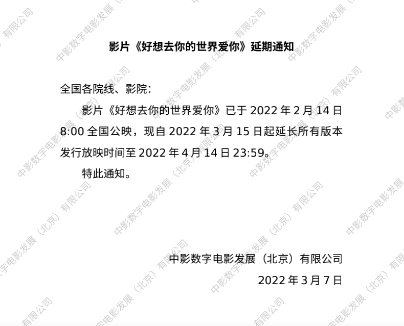 《好想去你的世界爱你》延期的通知
