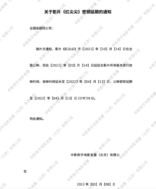 关于影片《红尖尖》第五次密钥延期的通知