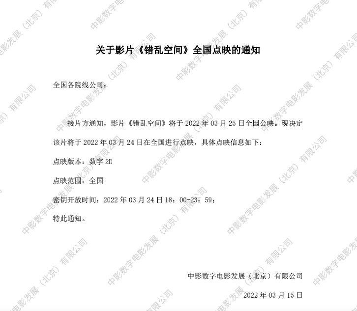 发行通知 » 《错乱时空》全国点映的通知