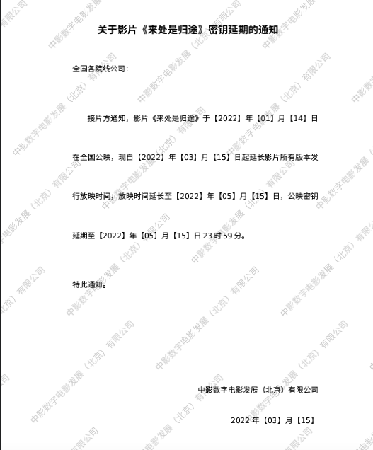 关于影片《来处是归途》第二次密钥延期的通知